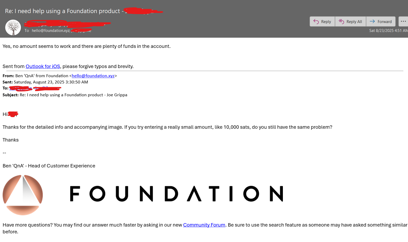 On Saturday at 5:30AM you said “Hi Thanks for the detailed info and accompanying image. If you try entering a really small amount, like 10,000 sats, do you still have the same problem?” and I replied about 1.5 hours later with “Yes, no amount seems to work and there are plenty of funds in the account.”