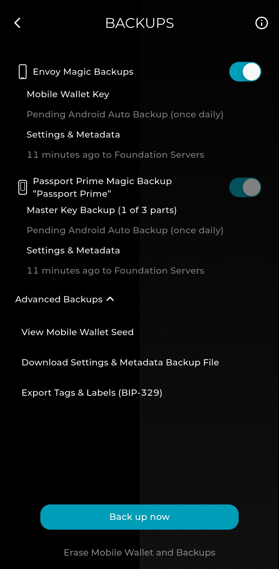 When I set up Passport Prime using a previously installed and updated version of Envoy, it only backed up using three KeyCards without Magic Backup. So I deleted Envoy and reinstalled it, and then the setup completed with Magic Backup plus two KeyCards.